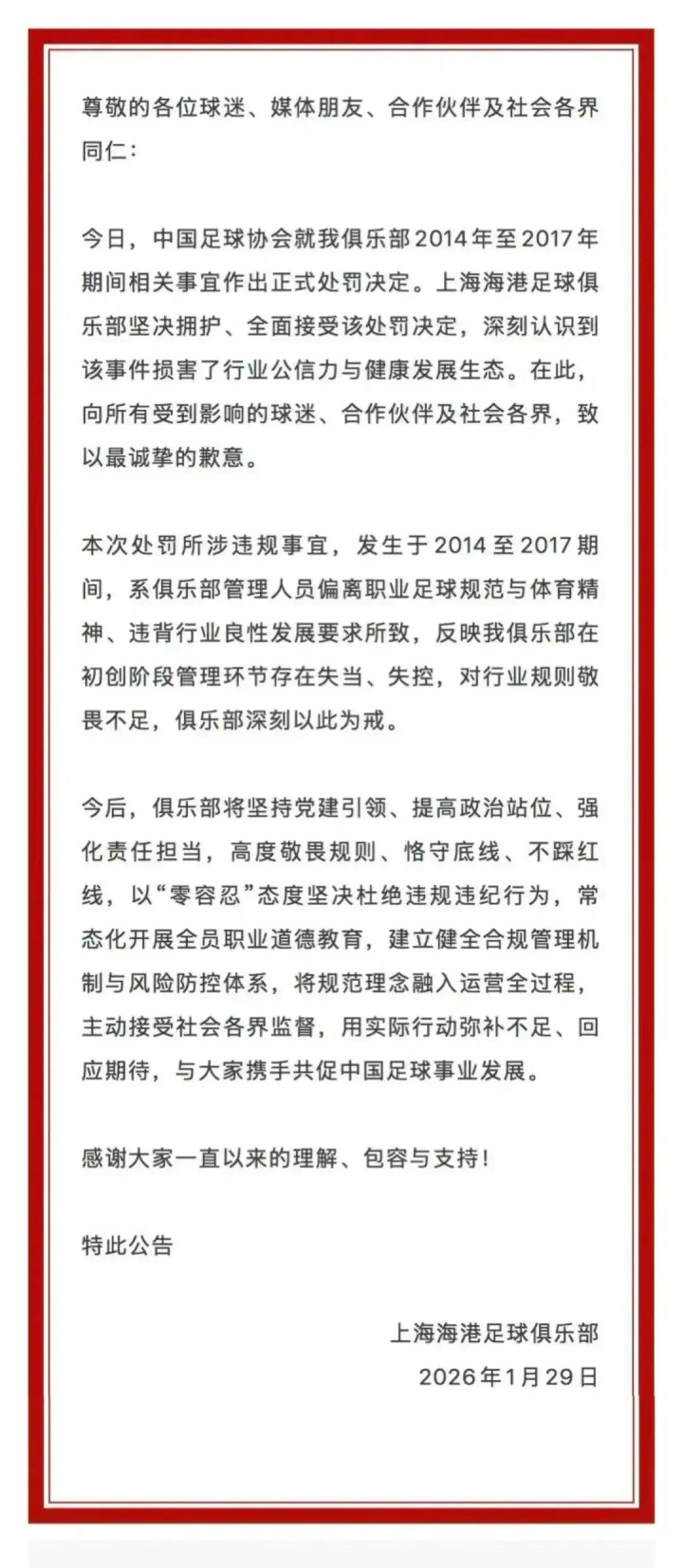 29日,上海海港足球俱乐部发布公告道歉:坚决拥护、全面接受处罚决定。