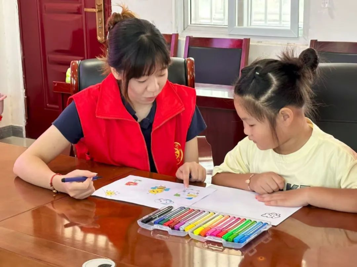 在温情互动环节,“爱心妈妈”与志愿者一同为孩子们送上精心准备的绘画笔套装,小小的画笔承载着满满的关爱与期待。随后,“爱心妈妈”与结对儿童围坐一起,围绕“我的家”“快乐暑假”等主题共同创作,孩子们用童真笔触描绘心中美好,“爱心妈妈”在旁耐心引导,笔触间流淌着无声的温情,让心灵距离在创作中悄然拉近。